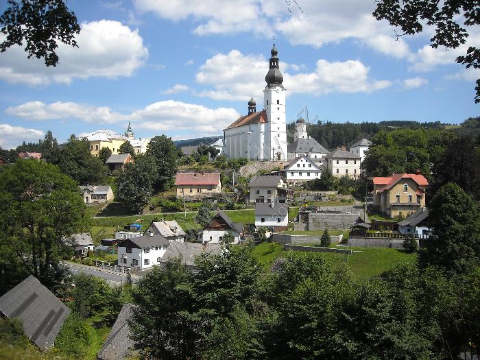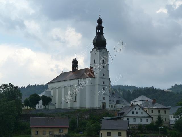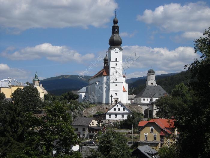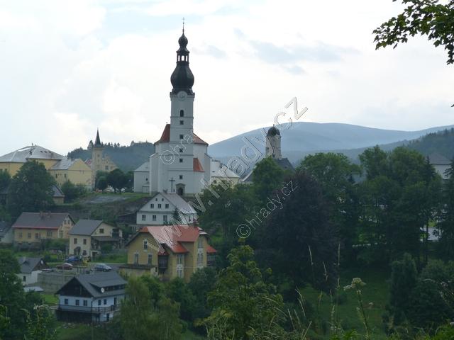 Dominantní pohled na kostel sv. Michala a budovu fojtství vpravo