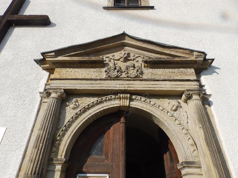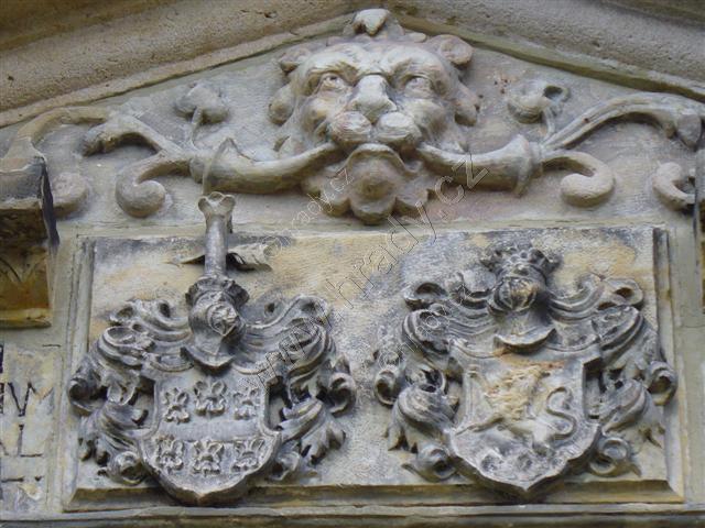 Detail renesančního portálu s nápisem a erby