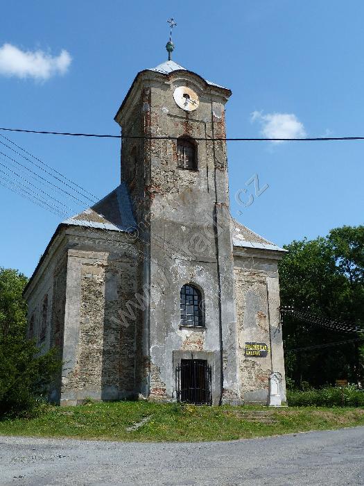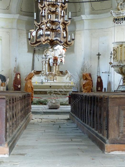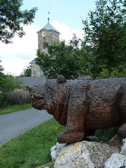 Plastika medvěda před galerií řezbářských děl, v pozadí kostel sv. Michala