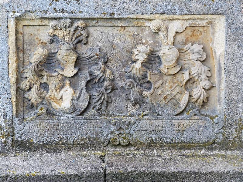 Heraldická deska s reliéf. znaky Jana st. z Kobylky z Kobylího a jeho manželky Anny Ederové ze Štiavnice (dat. 1605)