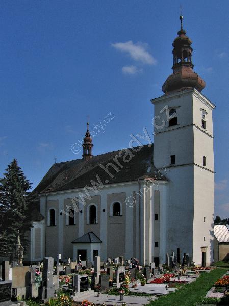 Pohled na kostel ze hřbitova který obklopuje kostel