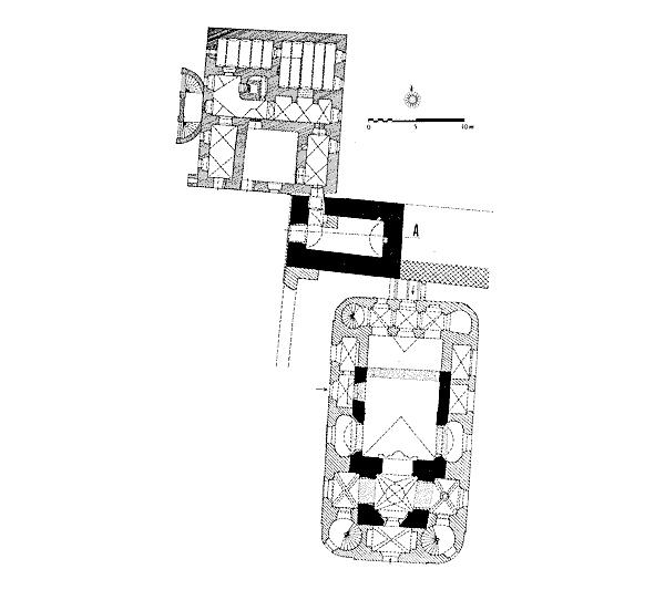 Tisová (Tachov), plán zámku, torza tvrze a kostela. Plně značeno zdivo gotické, křížky zdivo renesanční, šrafovaně zdivo barokní a tečkami zaniklé zdivo. Kresba Z. Procházka.