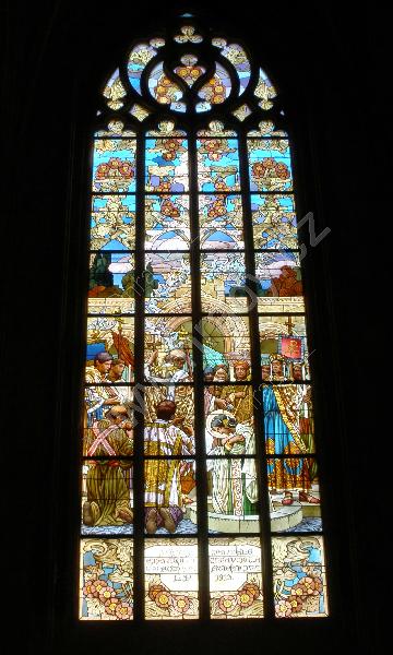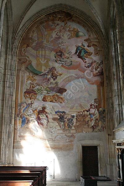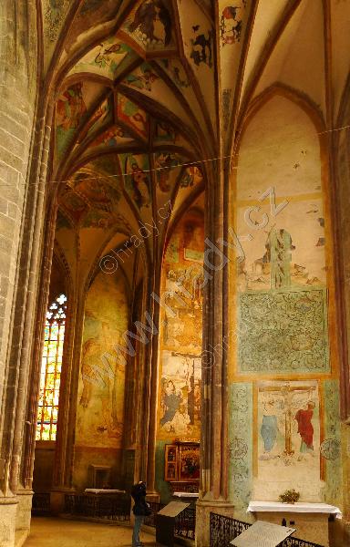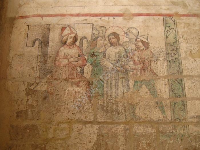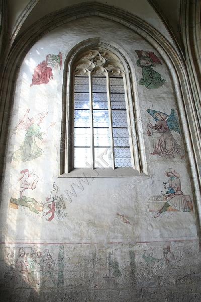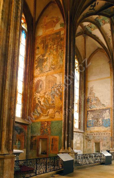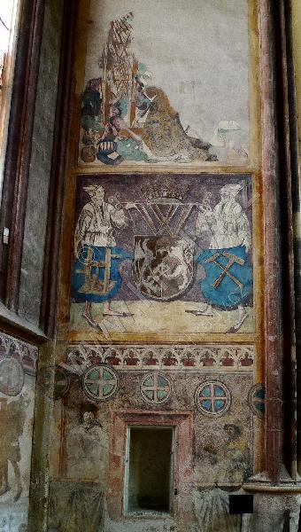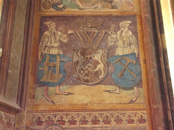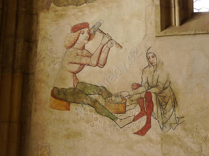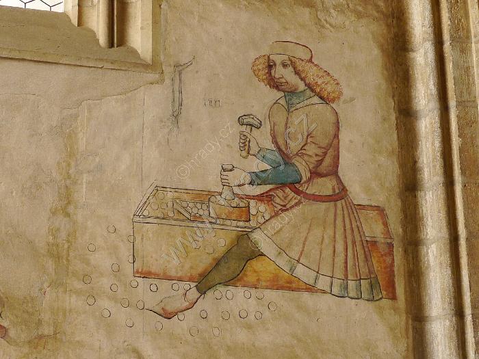 Fresky znázorňují mimo jiné činnosti při ražbě mince. Průhled oknem ukazuje okno dnešní novogotické západní stěny.