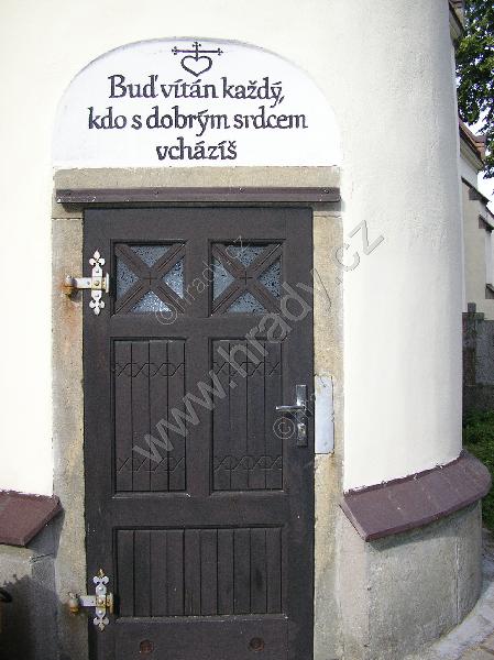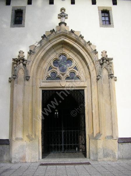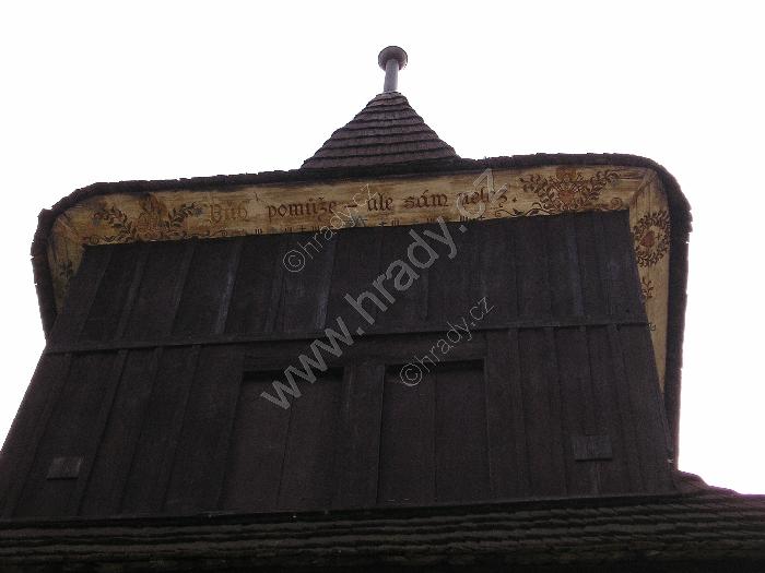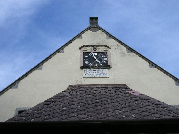Detail hodinového přístroje nad hlavním vchodem kostela.