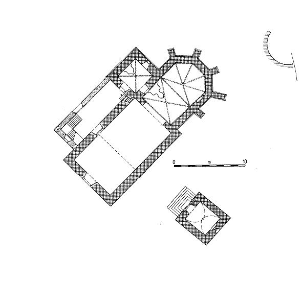 křížkovaně středověké zdivo, šrafovaně nedatované zdivo válcové stavby, tečkovaně mladší přístavby. U kleneb vyznačeny profily žeber