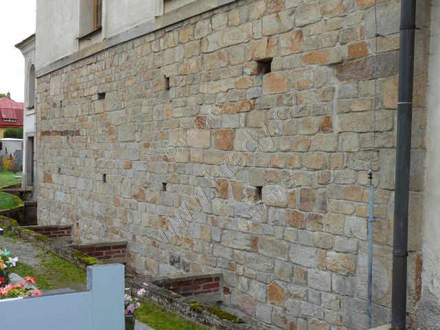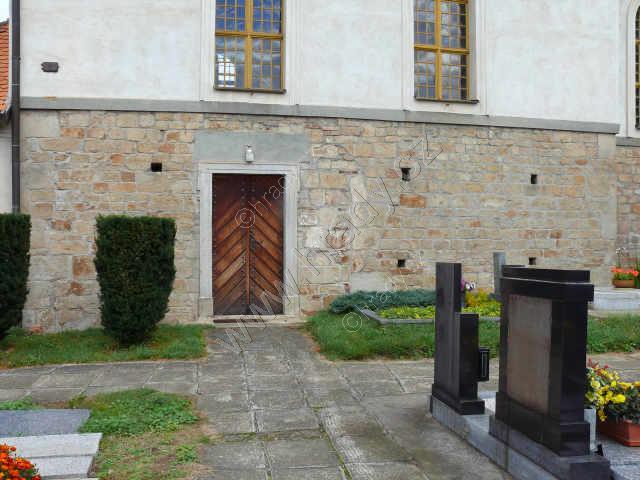 Vpravo od barokního vstupu jsou patrné zbytky románského portálu.