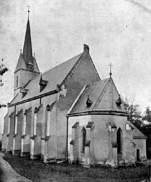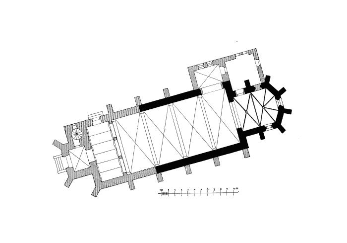 černě vyznačeno gotické zdivo, šrafovaně novogotická dostavba J. Mockera