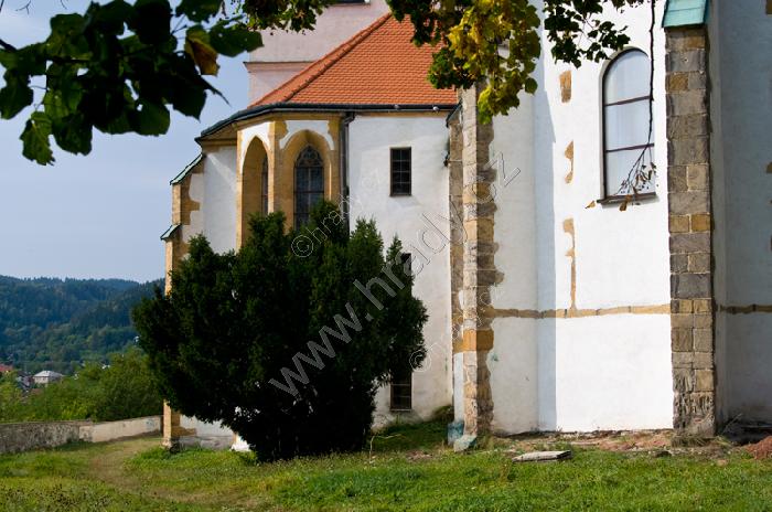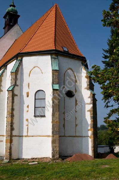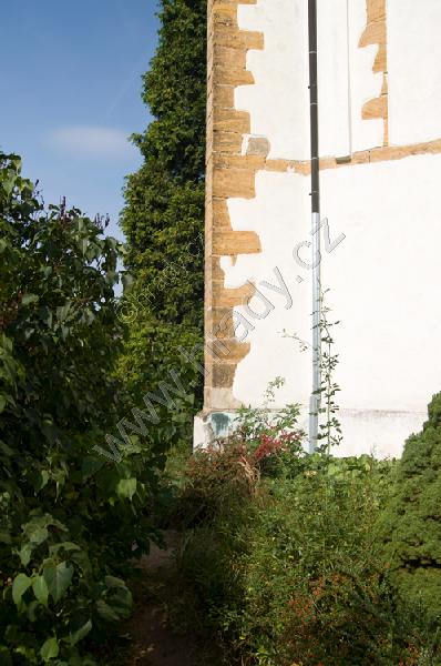 pohled z východu z bývalého hřbitova s několika náhrobky při východní zdi