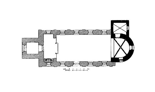 černě románské a gotické zdivo, šrafovaně novorománská přístavba z 19. století