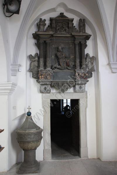 Portál z presbytáře do sakristie s křtitelnicí a renesančním epitafem