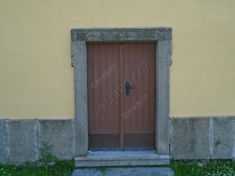 vstupní žulový pravoúhlý portálek na západní straně věže