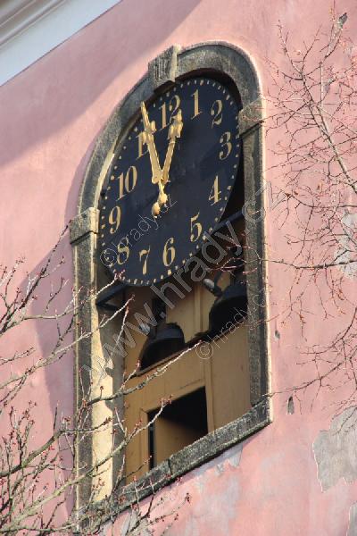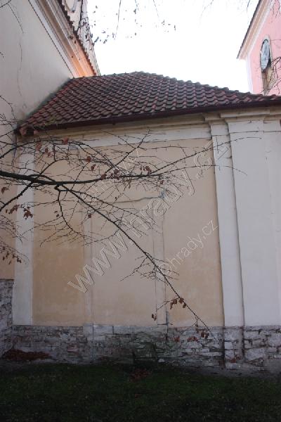 bíle gotické zdivo první fáze (přelom 13. a 14. stol.), šikmo šrafovaně gotické zdivo druhé fáze (před r. 1408), černě barokní úpravy, svisle šrafovaně úpravy na konci 19. století
