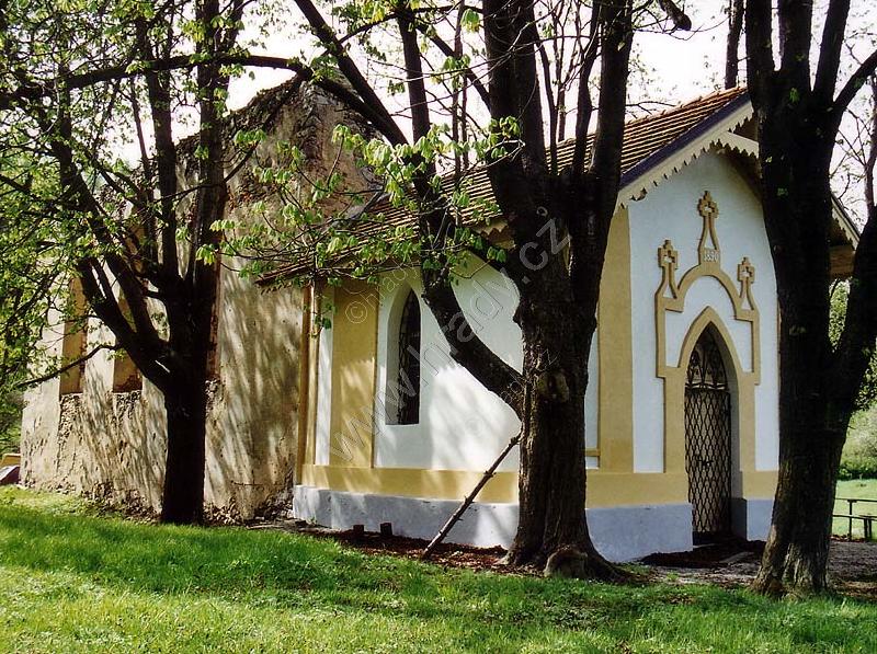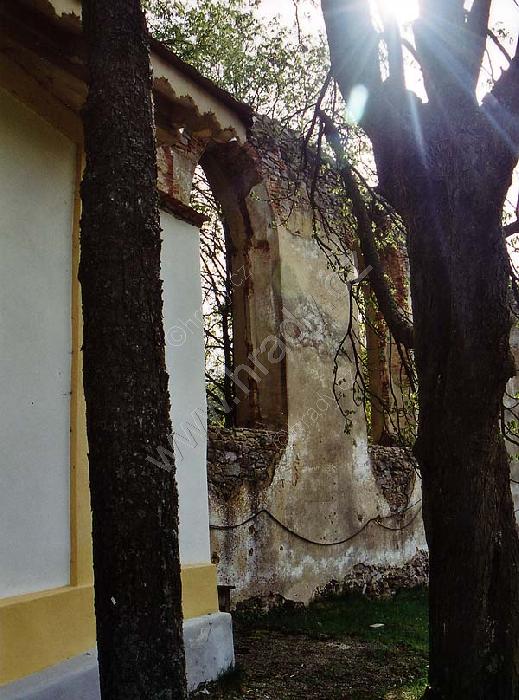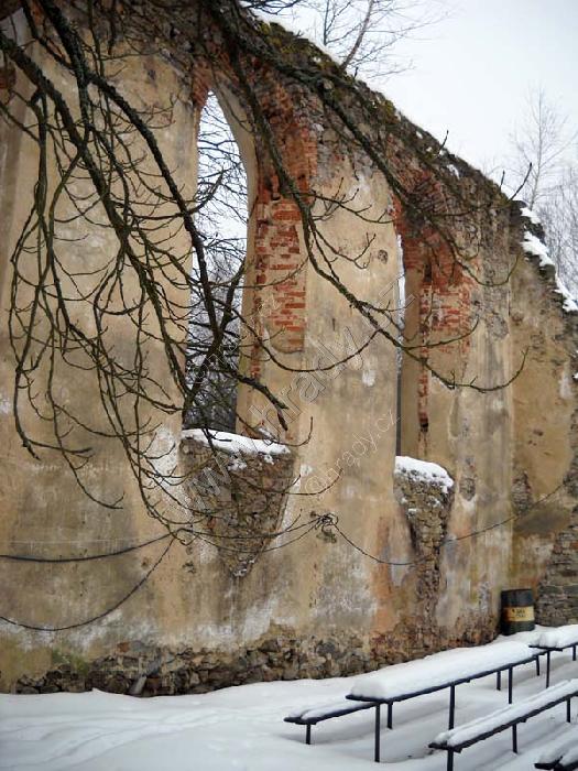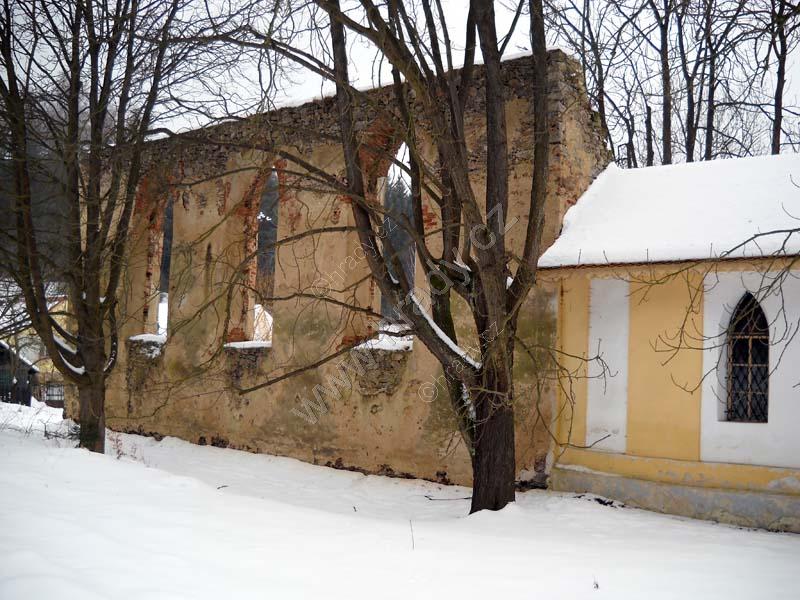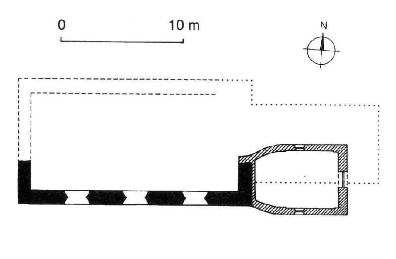 Černě je vyznačeno zachované zdivo, čárkovaně sledovatelný průběh základů a tečkovaně předpokládaný rozsah presbytáře. Šrafovaně je vyznačena kaple z roku 1890
