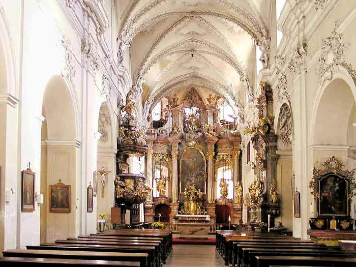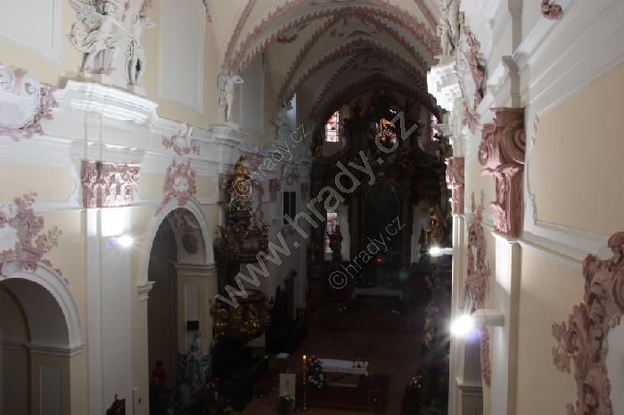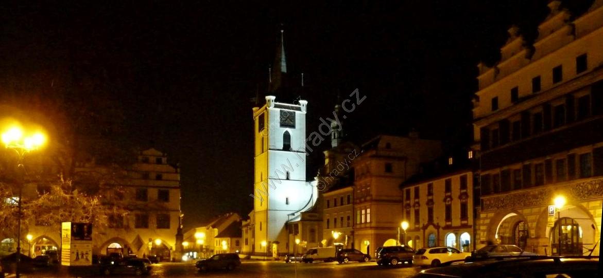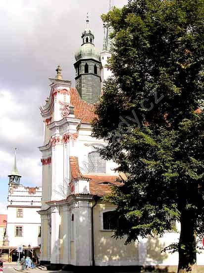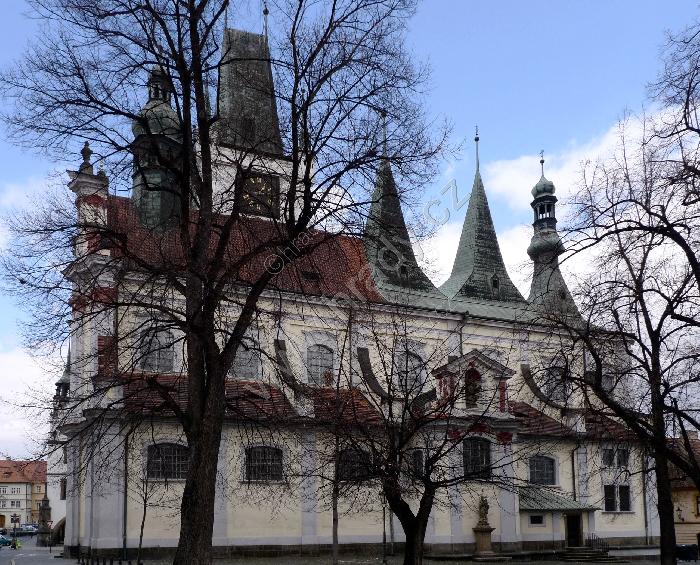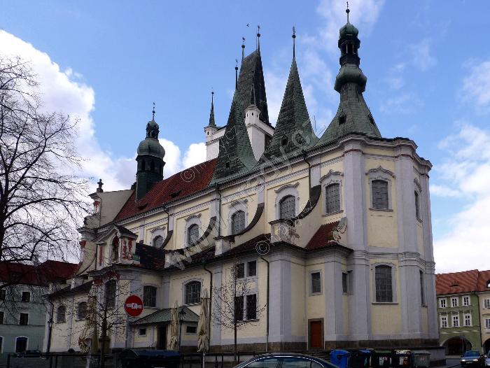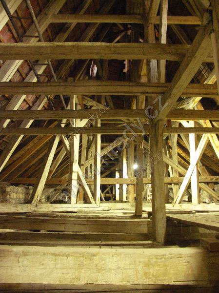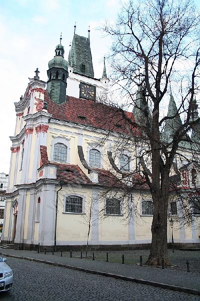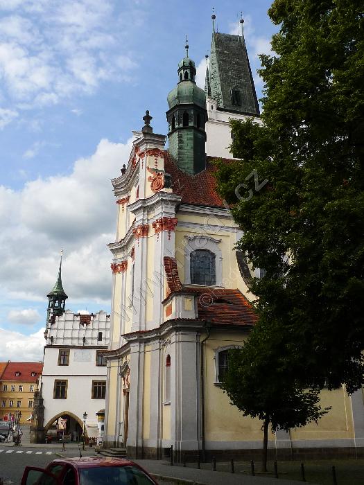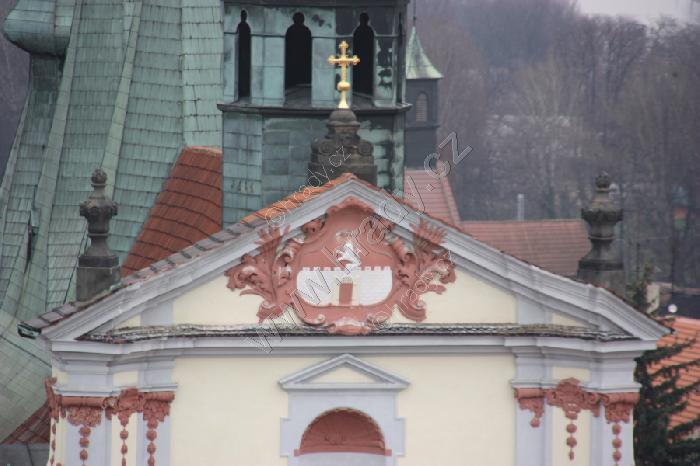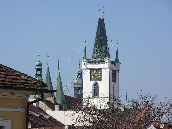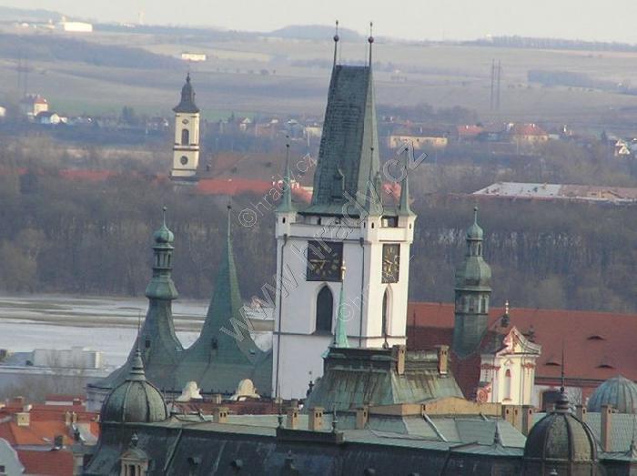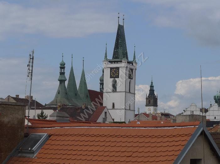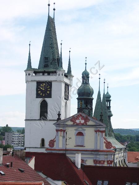 Střechy kostela a horní část městské věže z jesuitského kostela