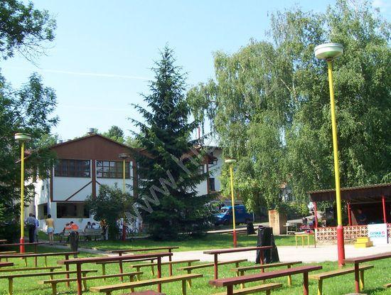 Zadní pohled na lázeňskou budovu. Součástí je areál s tanečním parketem, minigolf, koupaliště a tenisové kurty.