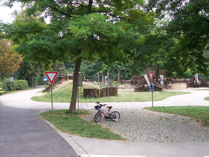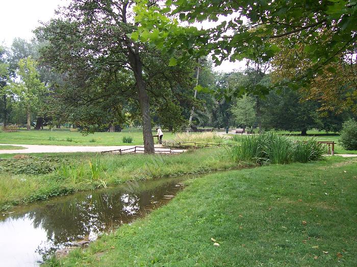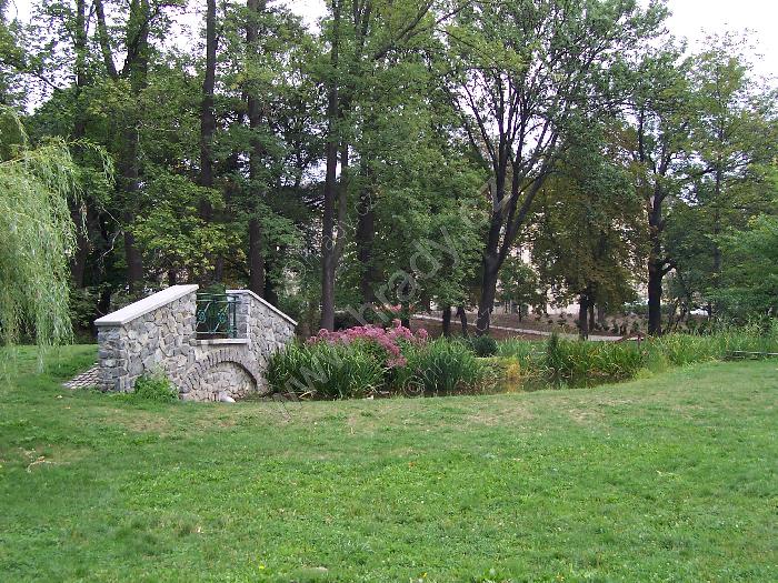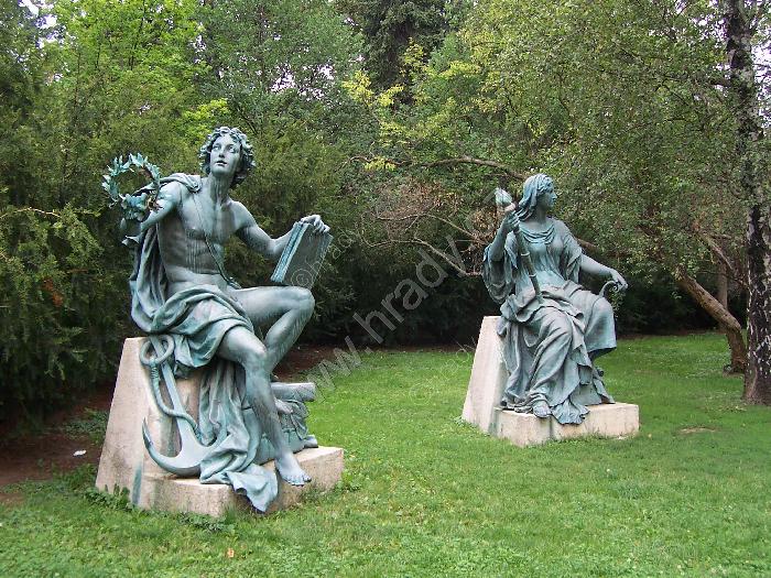 Brno - Lužánky - fontána se sousoším tří puttů (1860), v pozadí novorenesanční pavilon (1855)