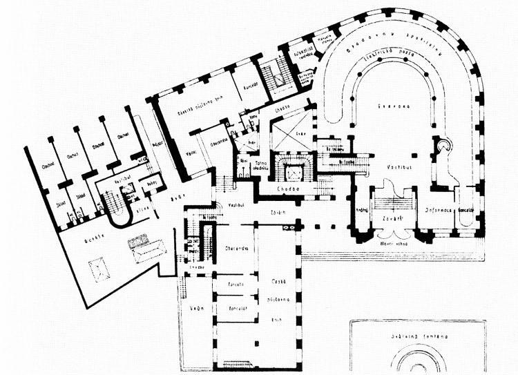 Půdorys vítězného návrhu Moravskoostravské spořitelny a městské knihovny dle K. Kotase