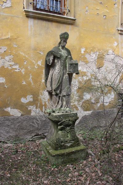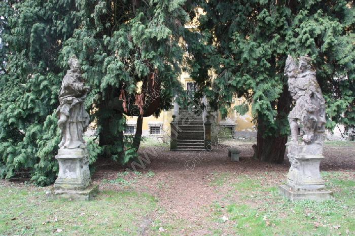 Sochy svatých Mikuláše Tolentinského (vlevo) a Floriána, umístěné dnes u zámku