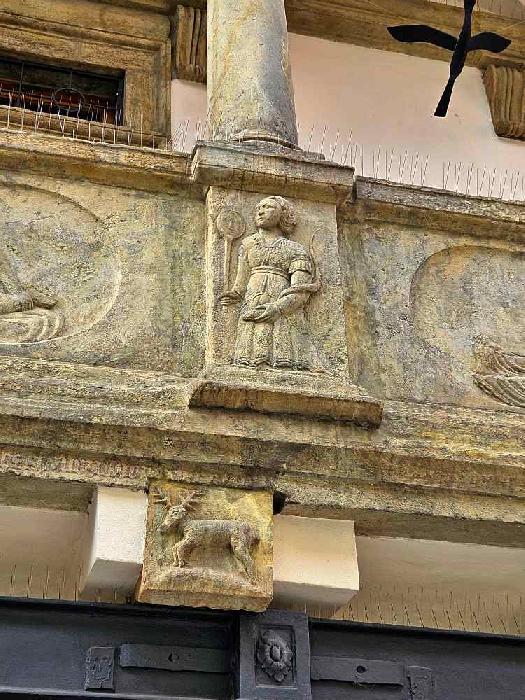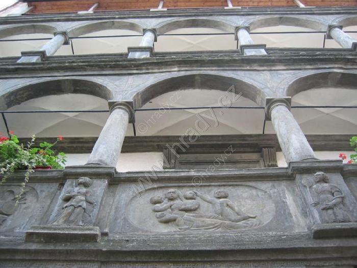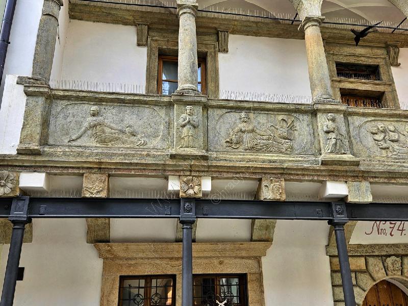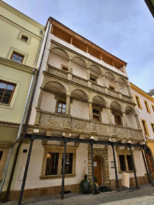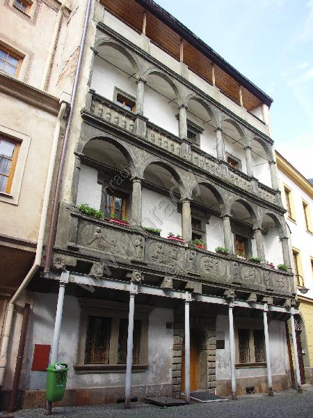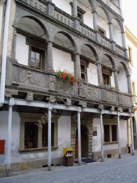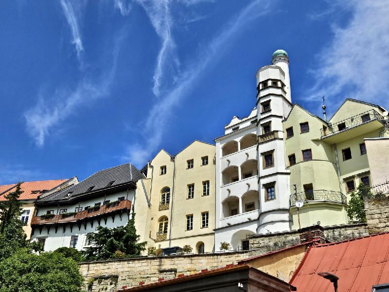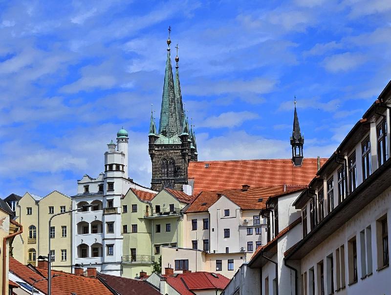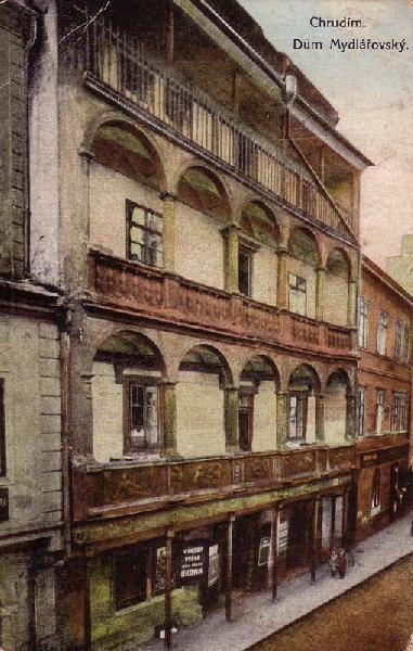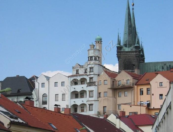 Pohled na dominanty Chrudimi - farní kostel a Mydlářovský dům z Havlíčkovy ulice