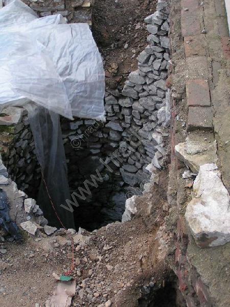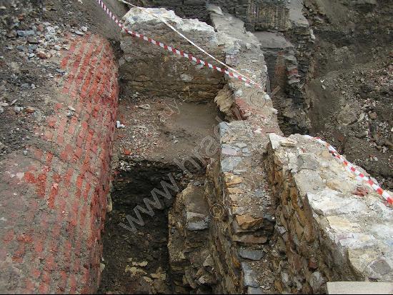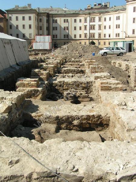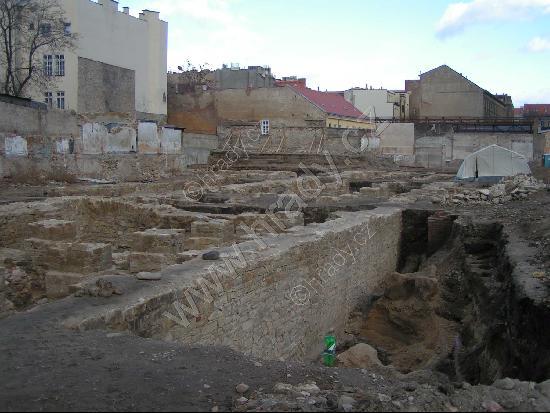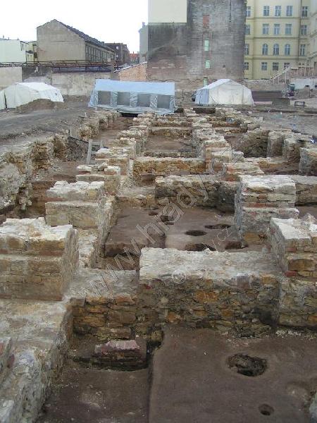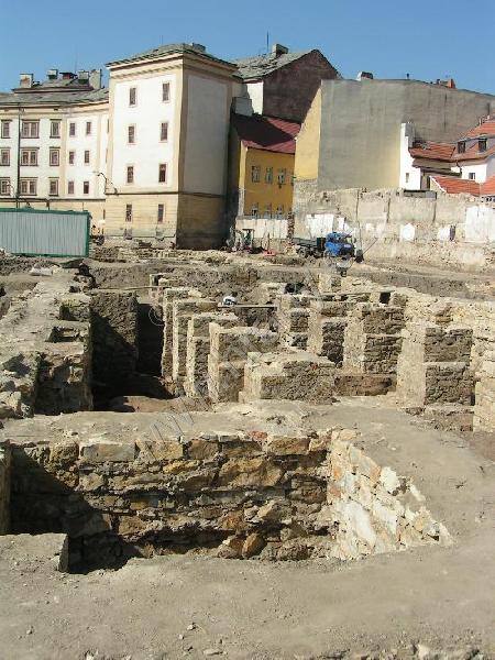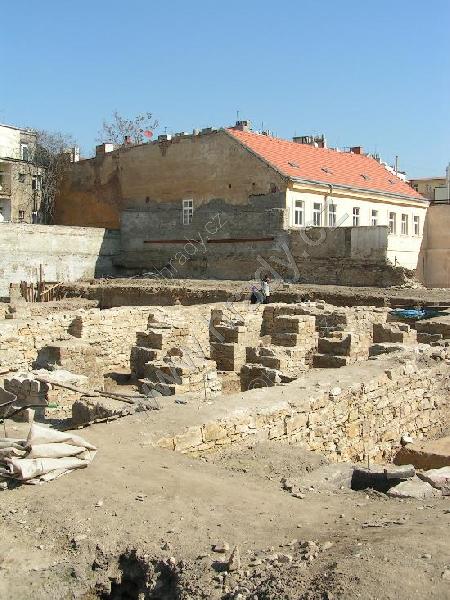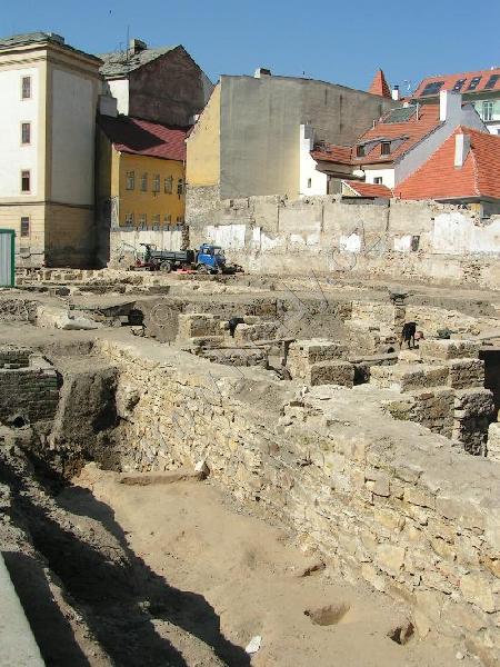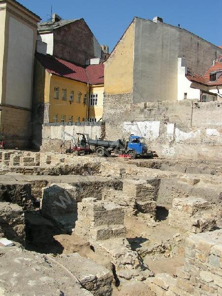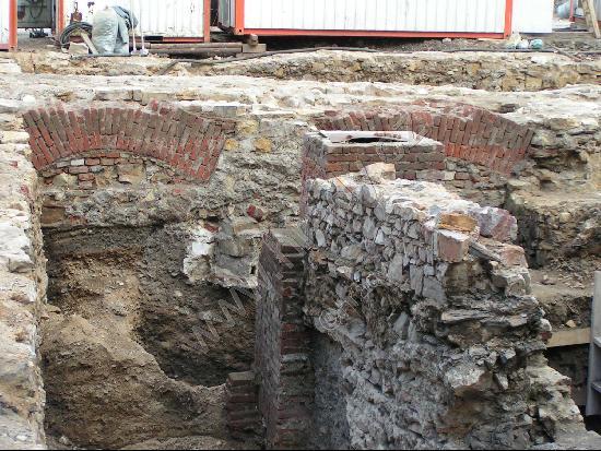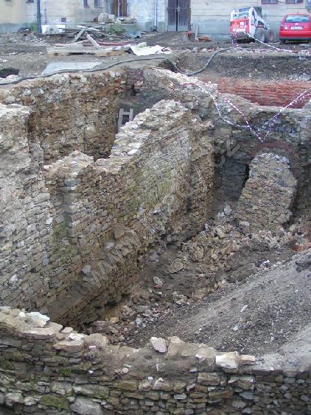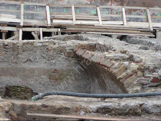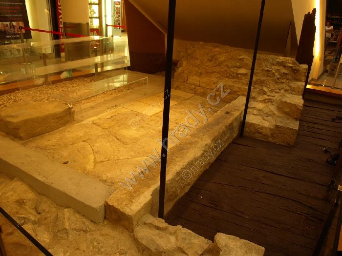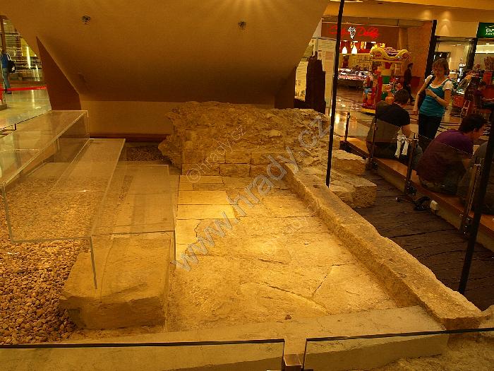 fragmenty románských zdí v nejnižším patře nákupního centra