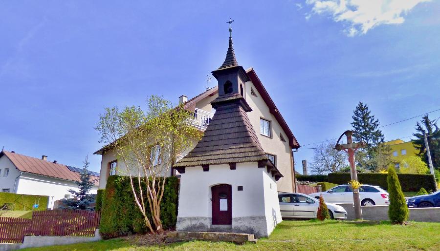 Drobná kaplička krytá šindelem, v horní části se zužující ve zvonici, pochází z r. 1764. V sousedství vysoký kamenný kříž s rameny spojenými stříškou, datován do r. 1845. Kaplička společně s křížem zapsána od r. 1958 do seznamu kulturních památek.