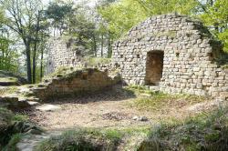 Skalní hrad, patrně největší a nejkomplikovanější, založený na poč. 15. stol., opuštěný v 16. stol. Hradní areál upraven v 19. stol. na romantický Pantheon. Na předhradí letohrádek z r. 1826 v podobě kaple.