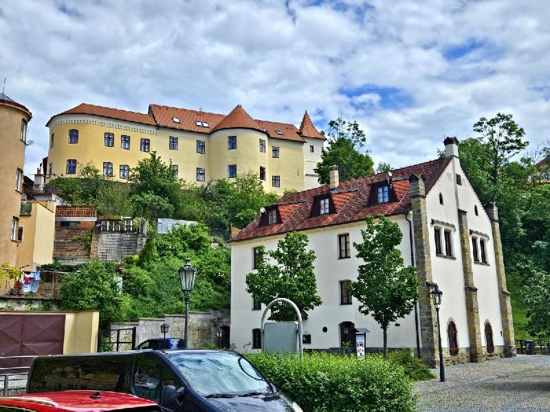 Celkový pohled na dům Na Puši s půlválcovou věží staré novoměstské hradby i mladší hranolovou vodárenskou věží z náměstí U Vodárny