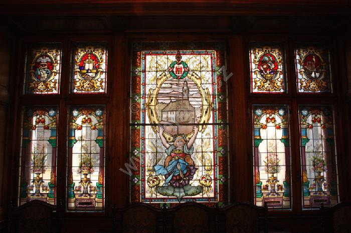 Vitraj s vyobrazením staré radnice