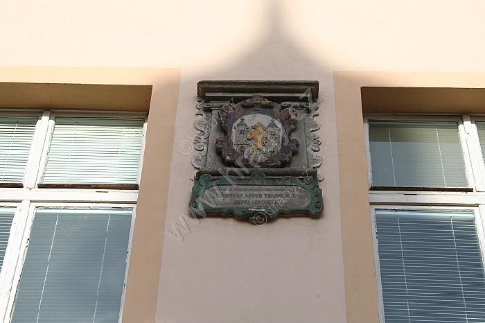 Kamenná deska s městským znakem na budově bývalého okresního soudu proti radnici