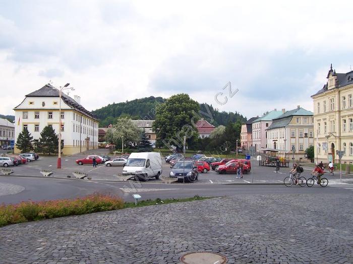 Náměstí v Novém Boru. Vlevo budova radnice, vpravo Sklářské muzeum.