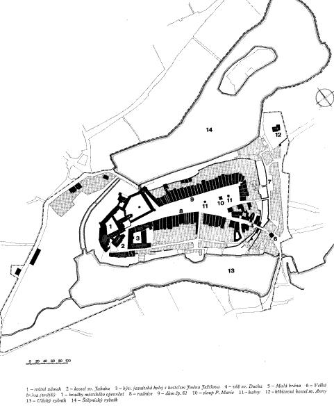 Západní část náměstí s věžicí zámku a jesuitskou kolejí