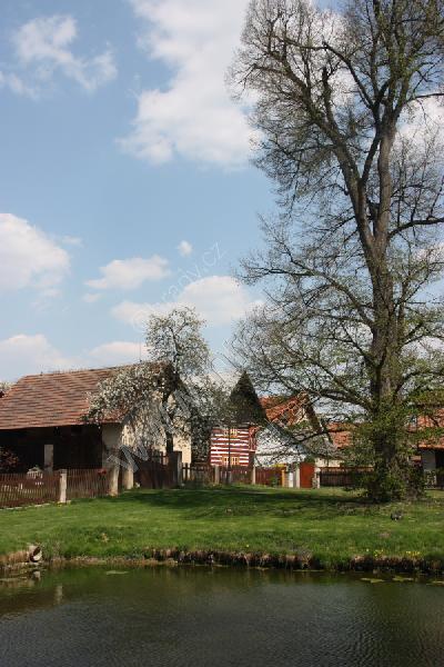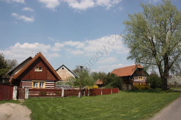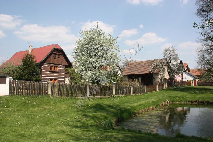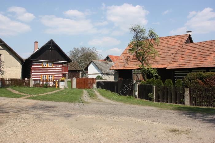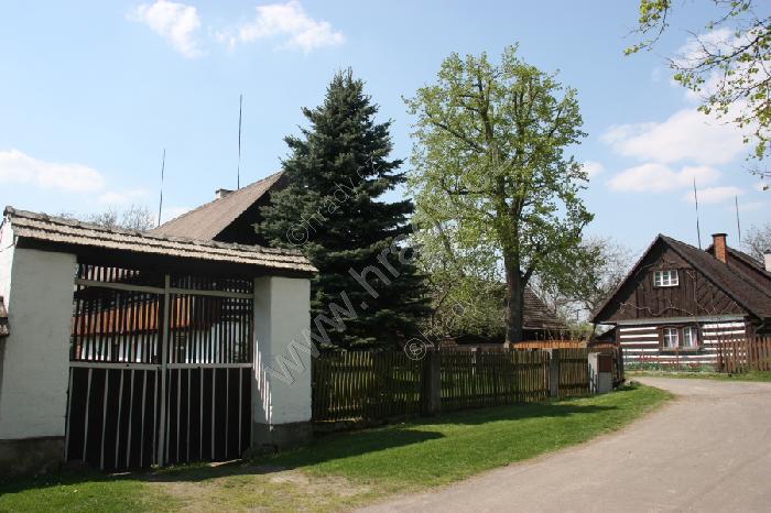 Severovýchodní kout návsi s obytným stavením usedlosti čp. 12 (vlevo) a hospodářskými budovami usedlosti čp. 13