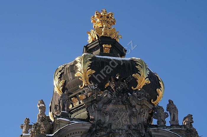 Detail báně Korunní brány s replikou polské královské koruny, nesené orlicemi