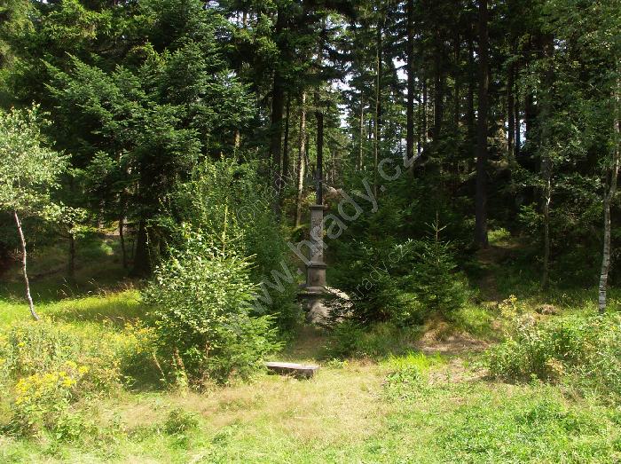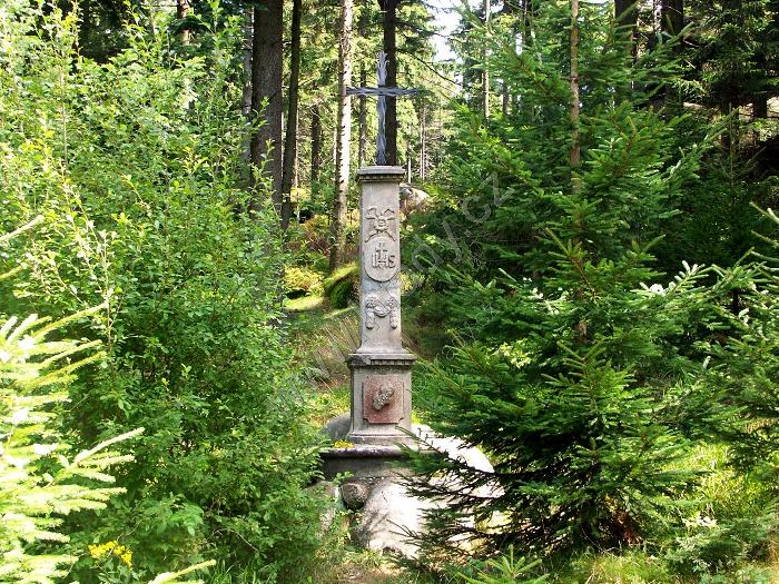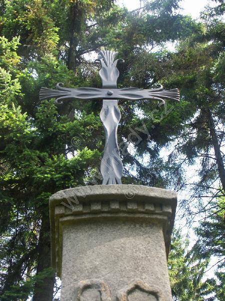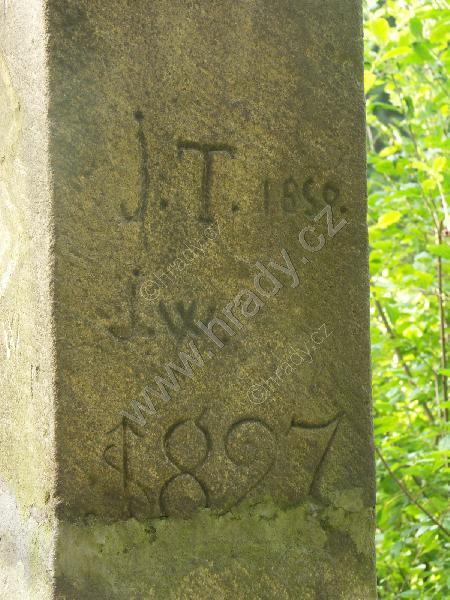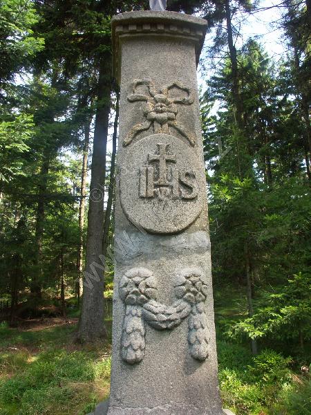 reliéf znaku Broumovského opatství - zbytky červé a zlaté polychromie