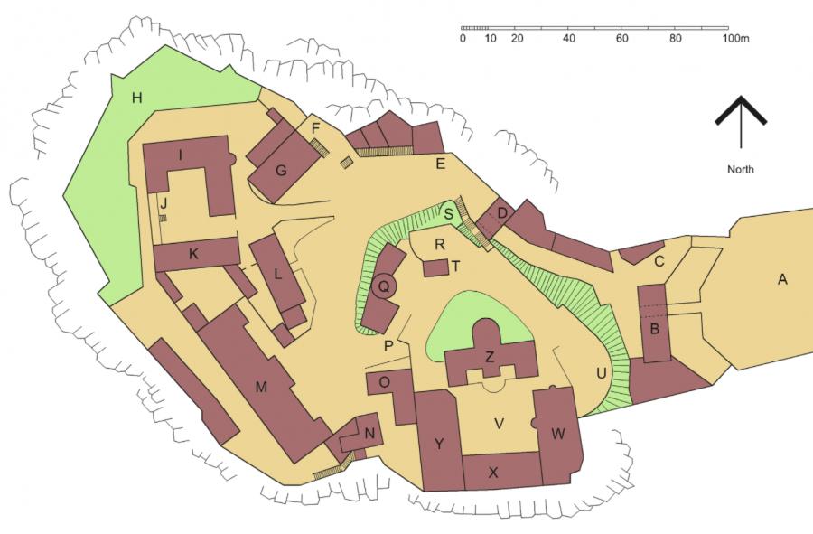 Hrad Edinburgh. A- esplanáda, B-1. brána, D-2. brána, Q-cisterna, T-kaple sv. Margarety, U-Půlměsíční baterie, V-hradní nádvoří, W-palác, X-velký sál, Y- palác královny Anny, Z-skotský válečný památník, G, H, I, J, K, L, M, N-předhradí, kasárna, nemocnice (I), vězení (N), dům velitele posádky (L).