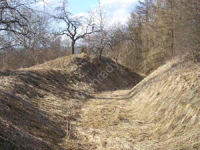 pohled přes příkop na nejzachovalejší část valu od východu, v pozadí rybník