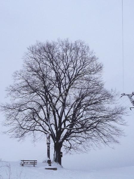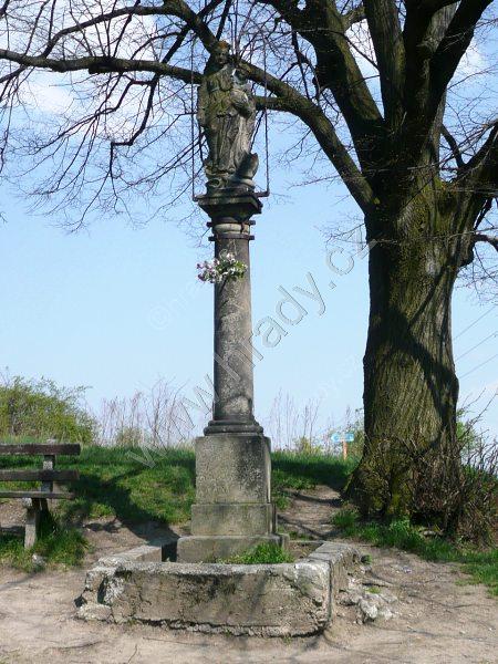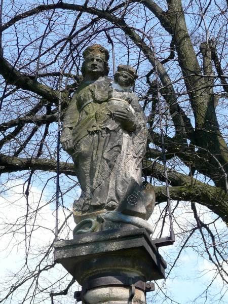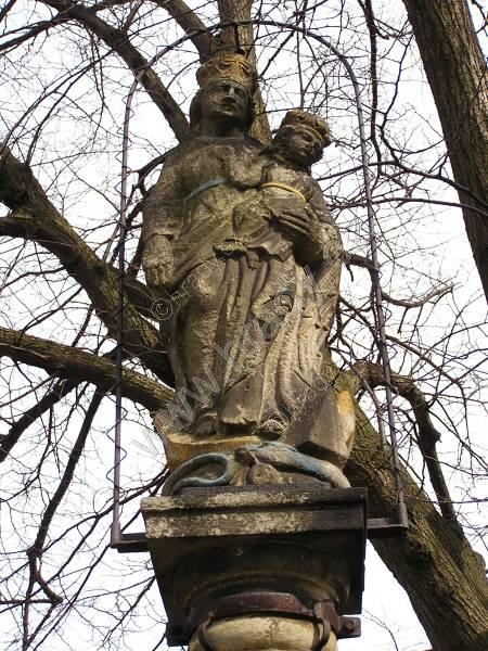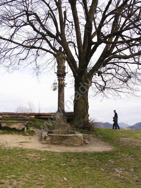 Celkový pohled na plastiku Panny Marie a blízkou lípu