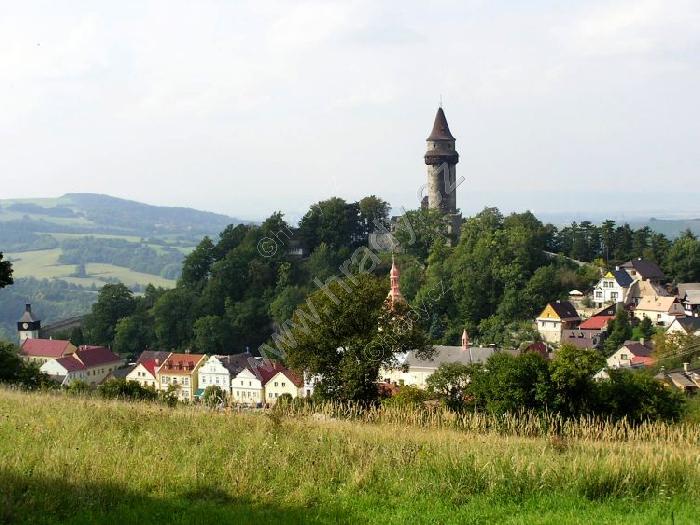 Celkový pohled na město Štramberk s hradem od místa s Plastikou Panenky Marie