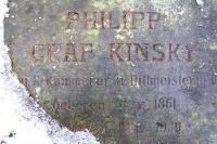 Filip Kinský se narodil 31. května 1861 a zemřel 8. dubna 1939. Prostá obdélná deska je označena jménem hraběte s jeho císařsko královským titulem a datumy narození a úmrtí. Nad jménem, v horní části náhrobku je kamenný znak Kinských v ozdobné kartuši s hraběcí korunkou. 2. Náhrobní deska Marie hraběnky Kinské rozené hraběnky Dubské z Třebomyslic, manželky majitele Spálova Filipa Kinského. Narozena 26. října 1864 a zemřela 17. dubna 1926. Podoba náhrobku je takřka shodná jako náhrobek jejího manžela hraběte Filipa. Erb v horní části desky však obsahoval i erb rodu Dubských z Třebomyslic. 3. Náhrobní deska Filipa Františka Josefa hraběte Kinského z Vchynic a Tetova, syna Filipa a Marie Kinských, který zemřel měsíc po svém narození. (*15. 5. 1914 - +29. 6. 1914). Drobný náhrobek je ozdoben rodovým znakem Kinských. 4. Náhrobní deska Mariany hraběnky Kinské, sestry Filipa hraběte Kinského. Narozena 26. července 1857, zemřela 23. června 1920. Náhrobek se stylem i znakem v horní části neliší od náhrobku hraběte Filipa. 5. Náhrobní deska Augusta Leopolda hraběte Kinského z Vchynic a Tetova, císařsko-královského komořího a rytmistra ve výslužbě, otce hraběte Filipa. August Kinský se zasadil o přestavbu zámku v Lešné v klasicistním slohu. Hrabě August zemřel na zámku Lešná 18. dubna 1891 v 74 letech. I tento náhrobek zdobil v horní části erb Kinských. Dnes je bohužel tato kartuše se znakem odcizená. 6. Náhrobní deska Frederiky hraběnky Kinské z Vchynic a Tetova, rozené hraběnky Dubské z Třebomyslic. Hraběnka Frederika, manželka hraběte Augusta, zemřela v Praze 29. prosince 1895 v 67 letech. Horní část náhorbní desky je bez znaku, dvě odřené části však naznačují, že i zde mohl být, pouze je opět ukraden.