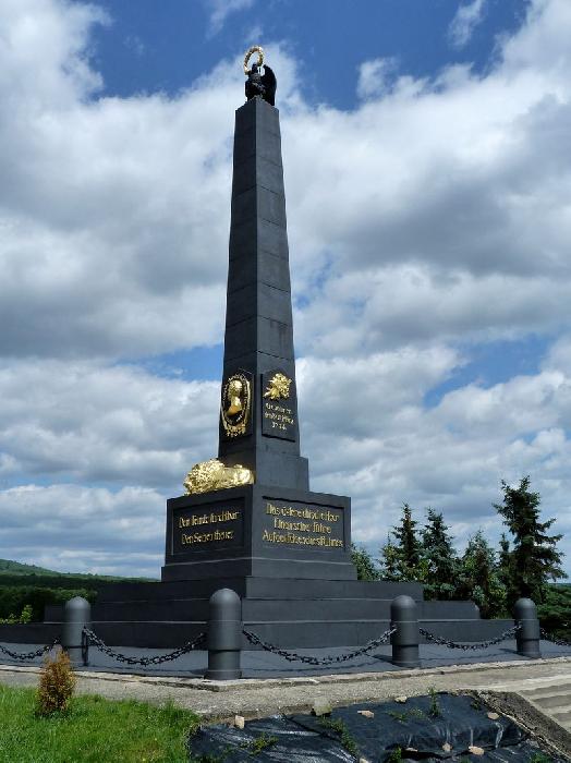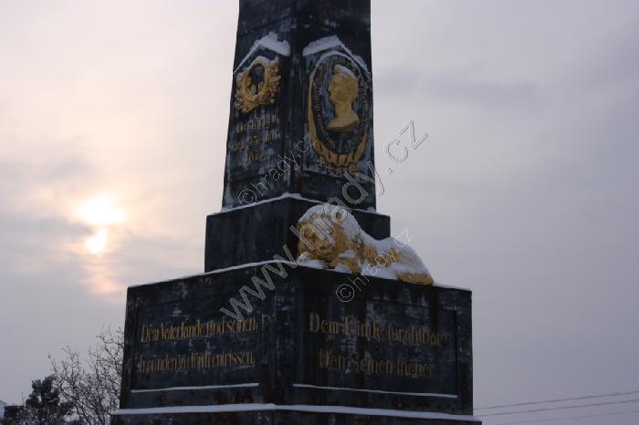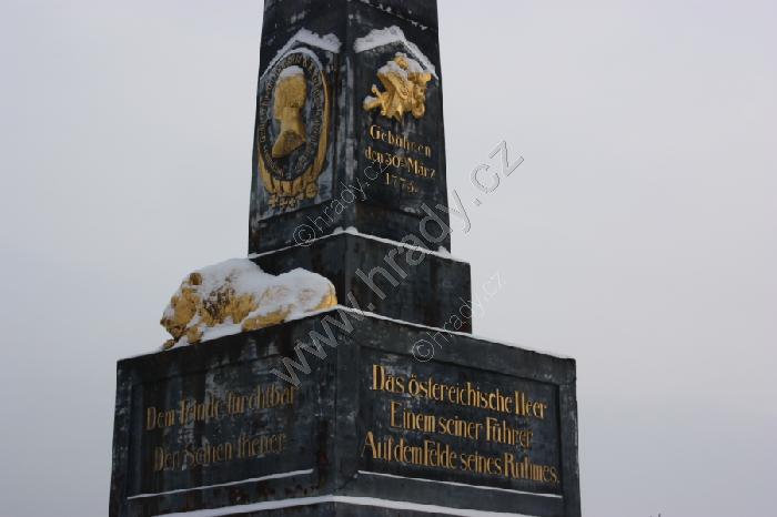 Na podstavci německý nápis "Rakouská armáda jednomu ze svých vůdců na poli slávy", na obelisku datum narození gen.Colloredo-Mansfelda 30.března 1773