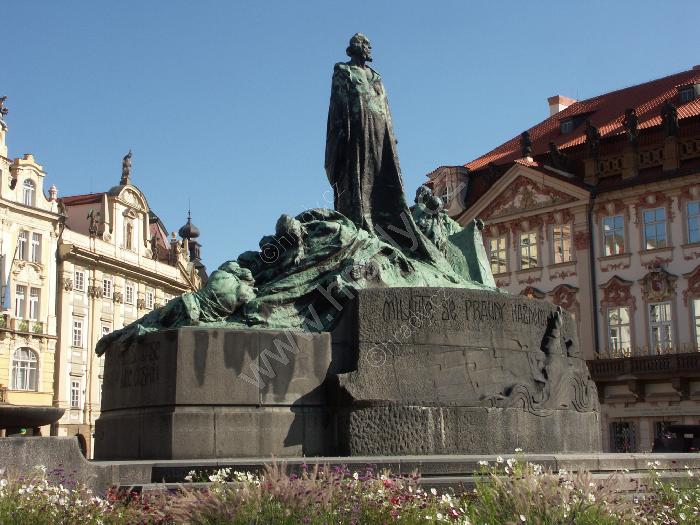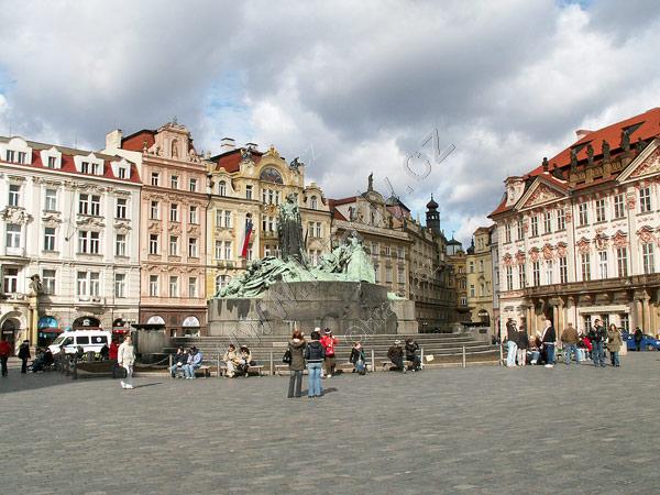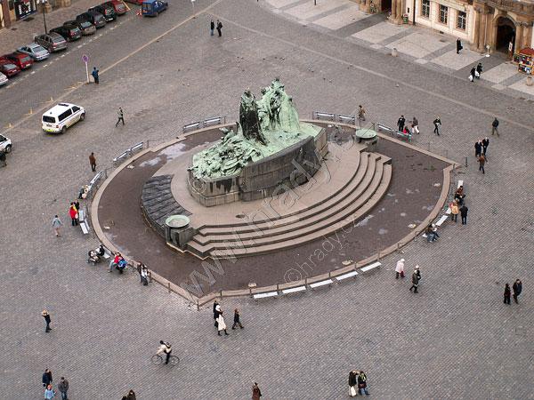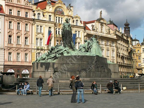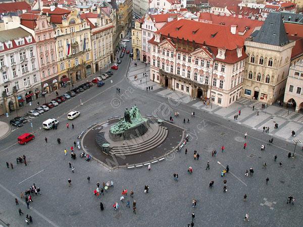 Pohled na pomník mistra Jana Husa ze Staroměstské radnice.