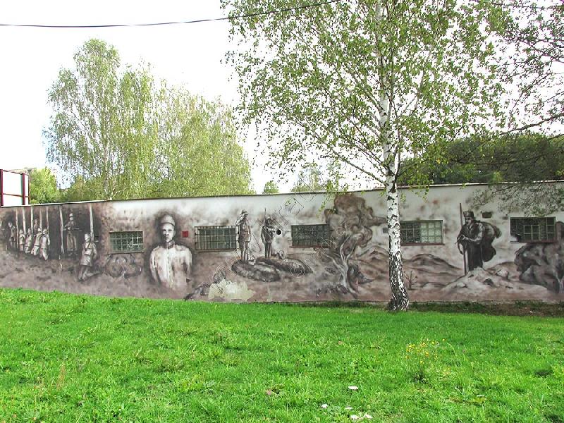 Grafická úprava stěny garáží s výjevy z Rumburské vzpoury a popravy vzbouřenců.