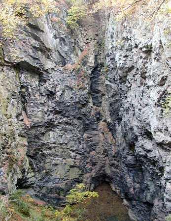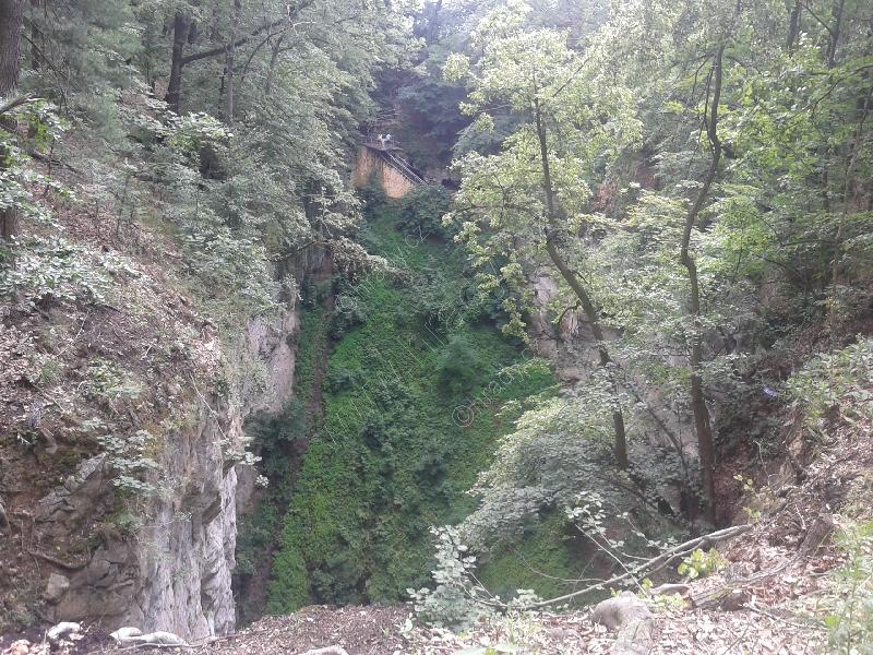 Pohled na můstek a zarostlou stěnu propasti