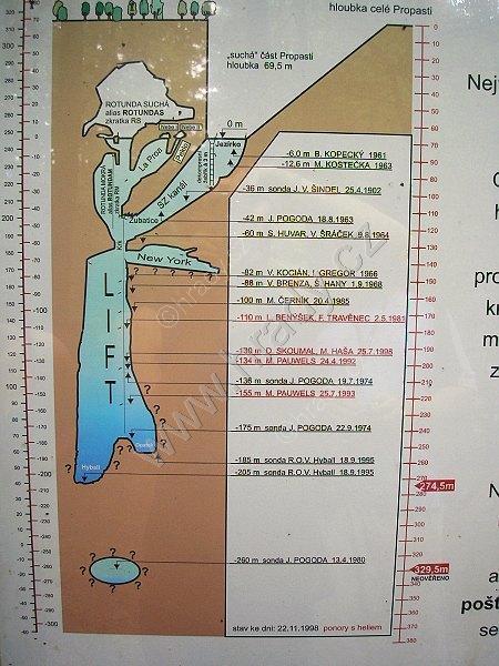 řez propastí s daty a hloubkou uskutečněných ponorů