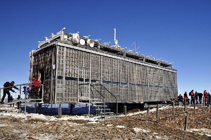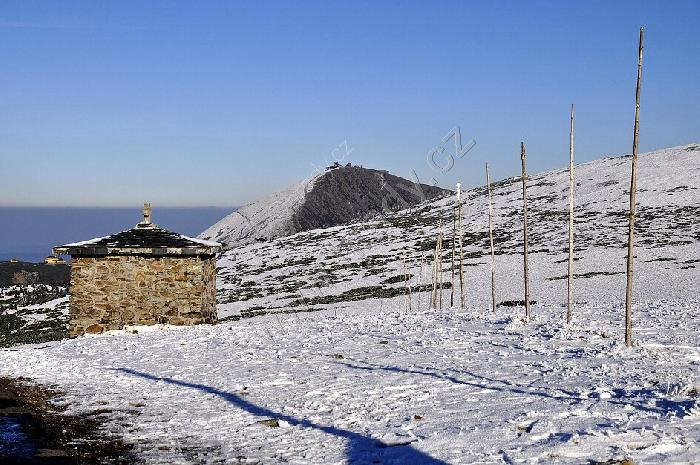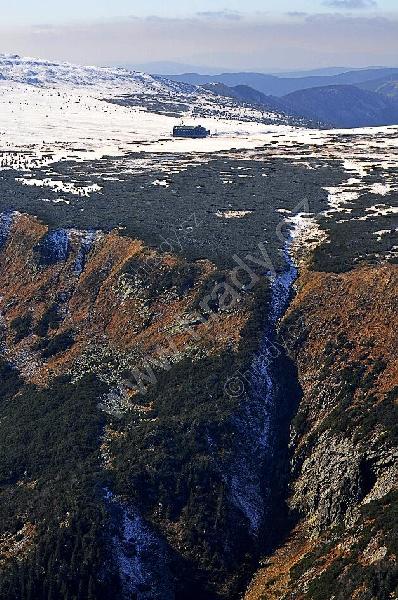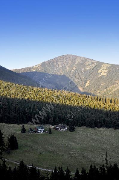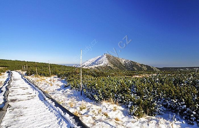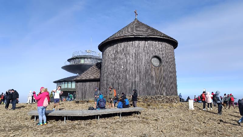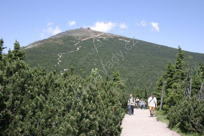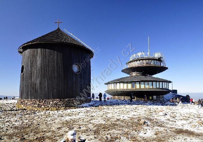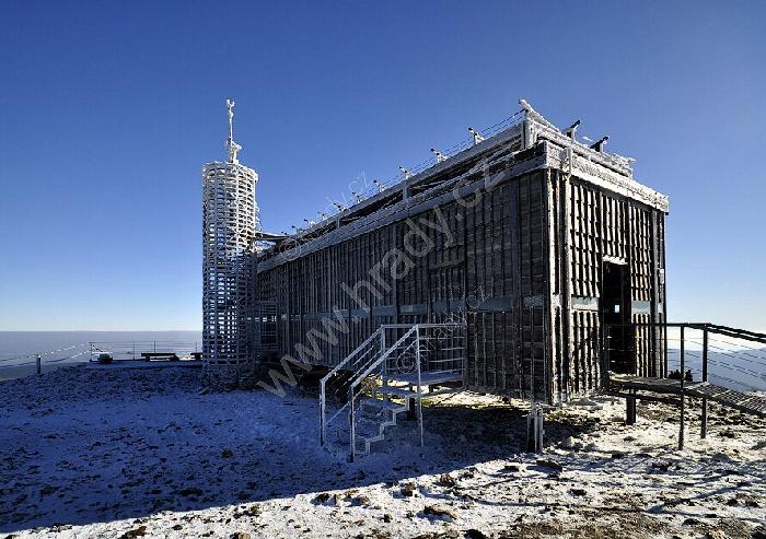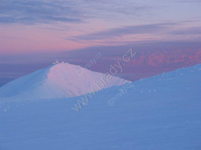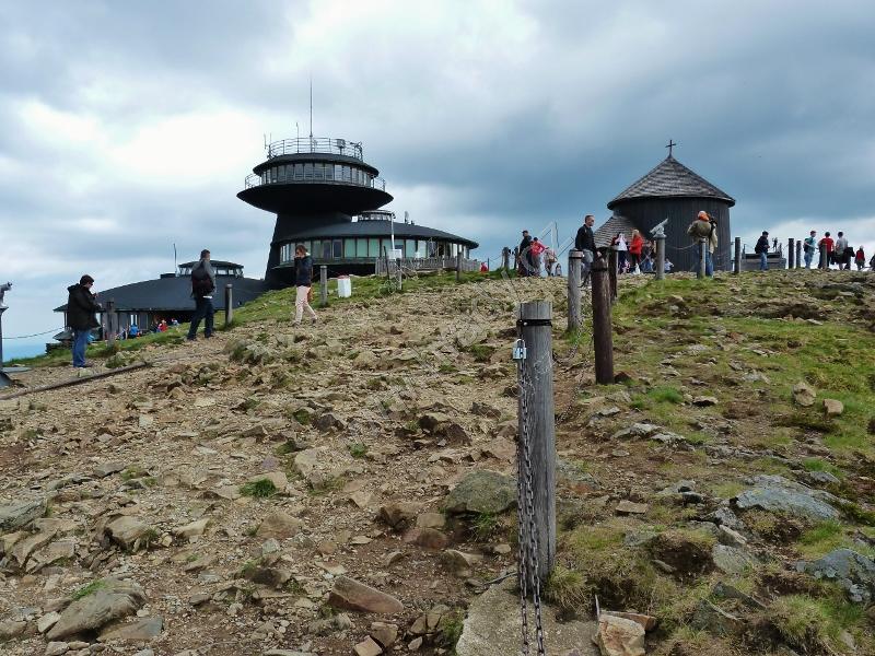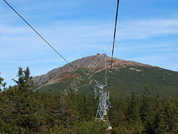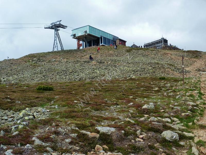 Vrchol hory od jihovýchodu. Nalevo je horní stanice lanovky a napravo Česká poštovna.