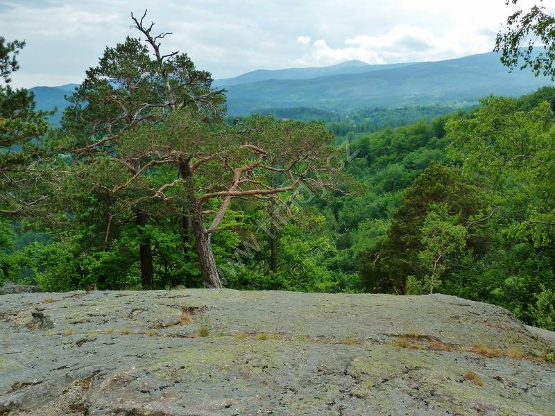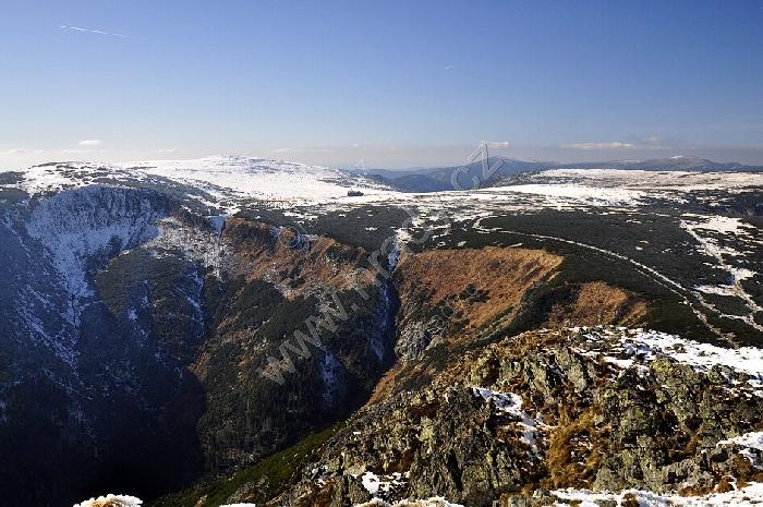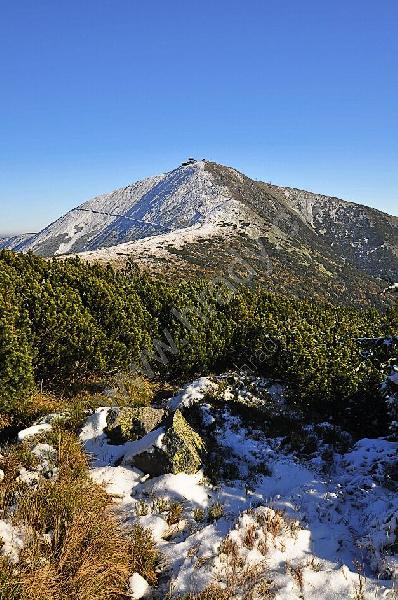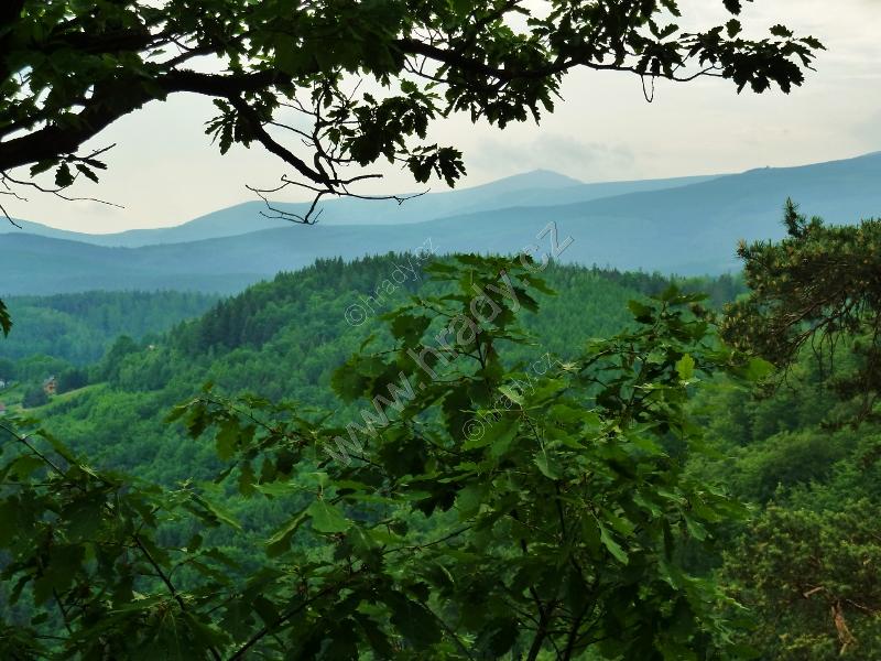 Polské Krkonoše se Sněžkou při pohledu od hradu Chojnik.
