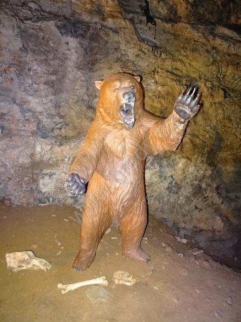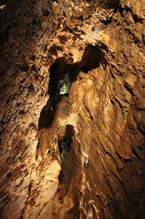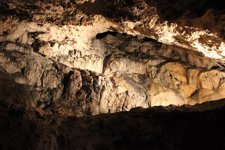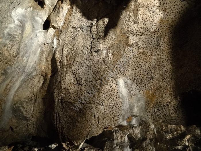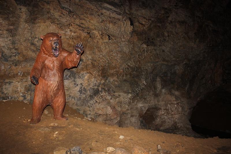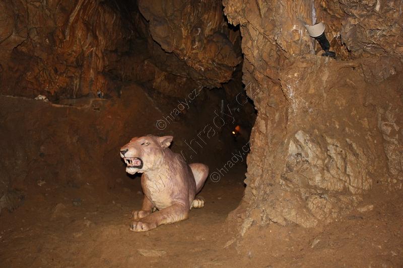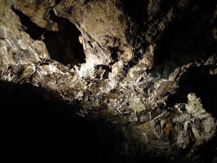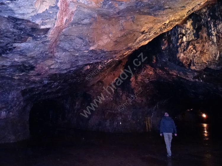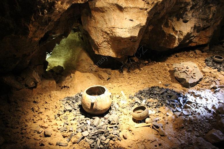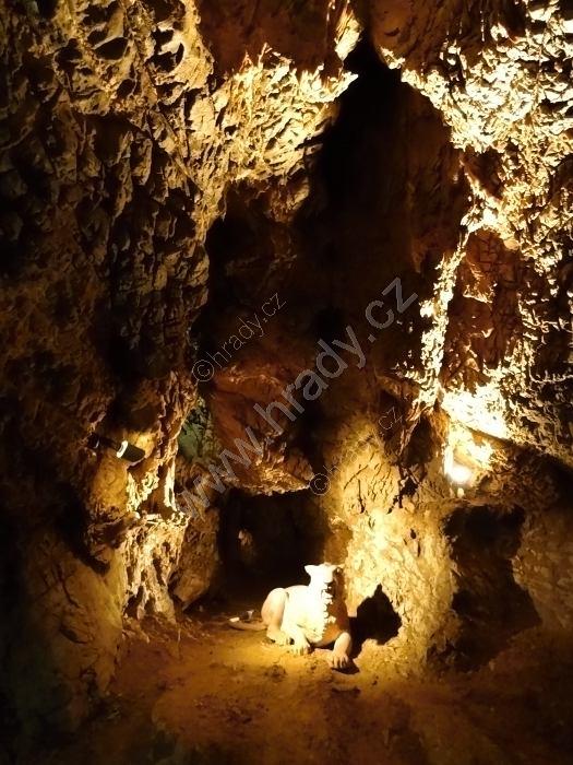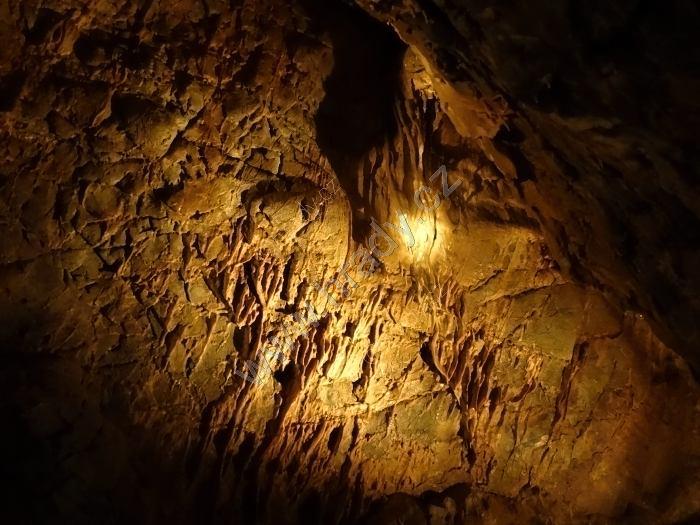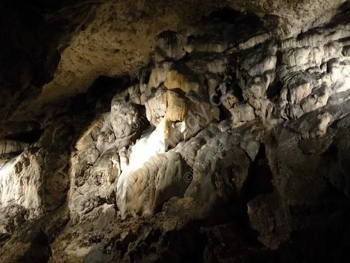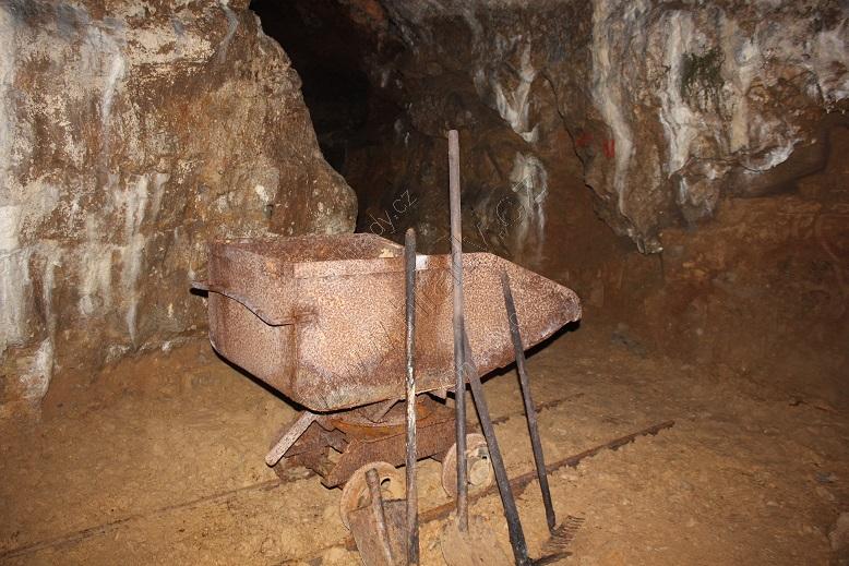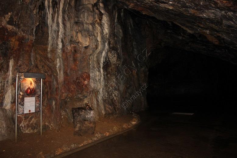Připomínka devastace jeskyně při těžbě fosfátových hlín.