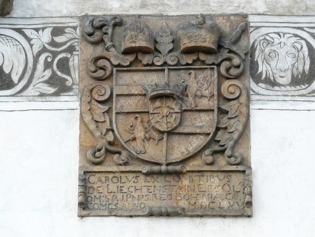 erb olomouckého biskupa Karla z Liechtenštejna s datováním 1666 na průčelí