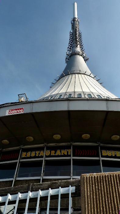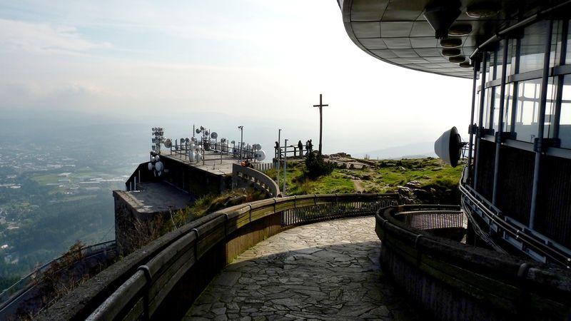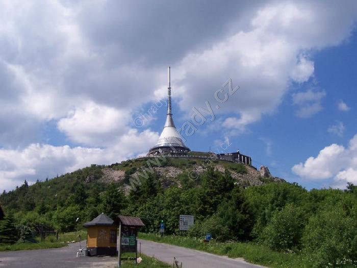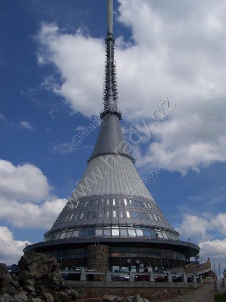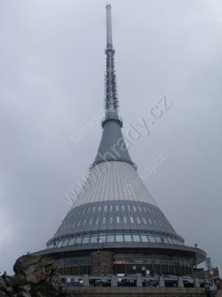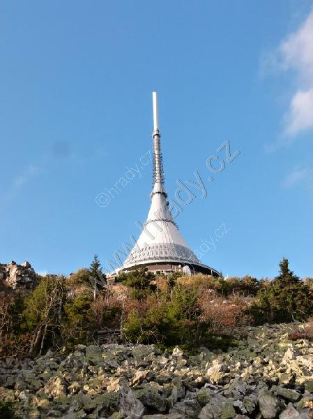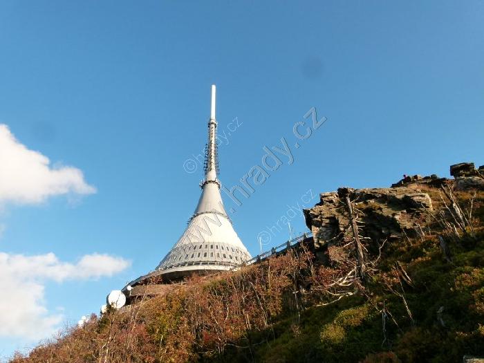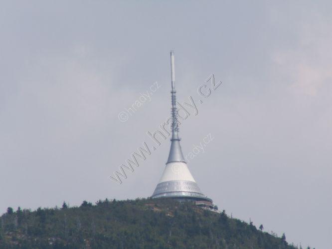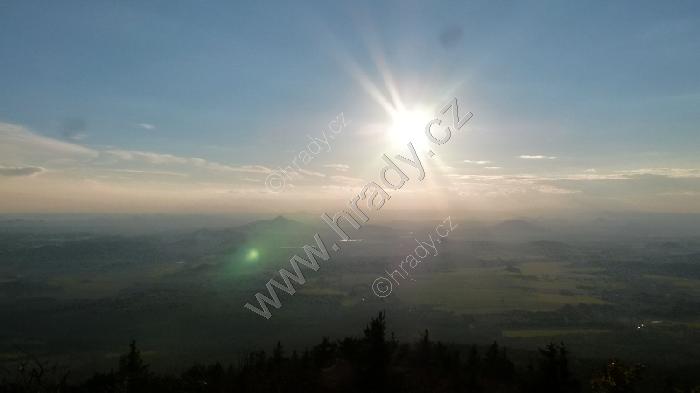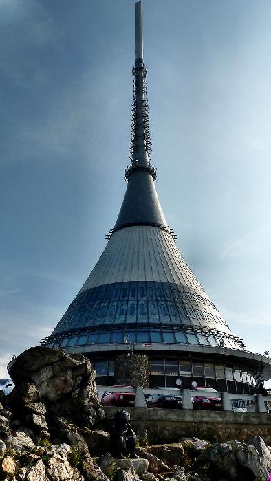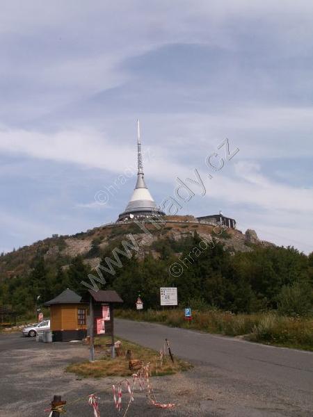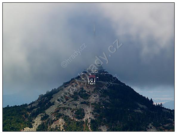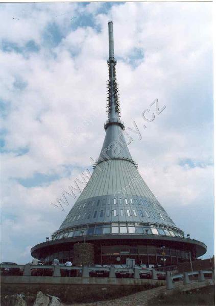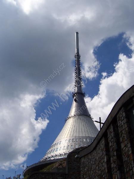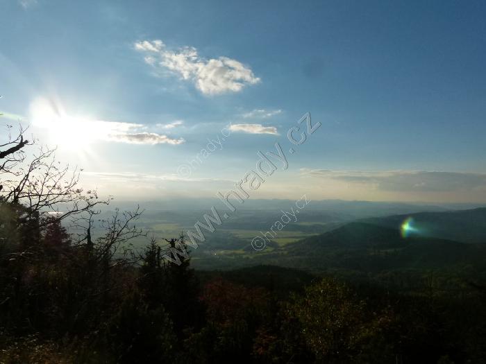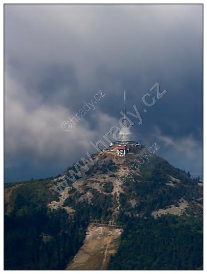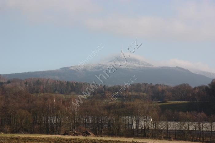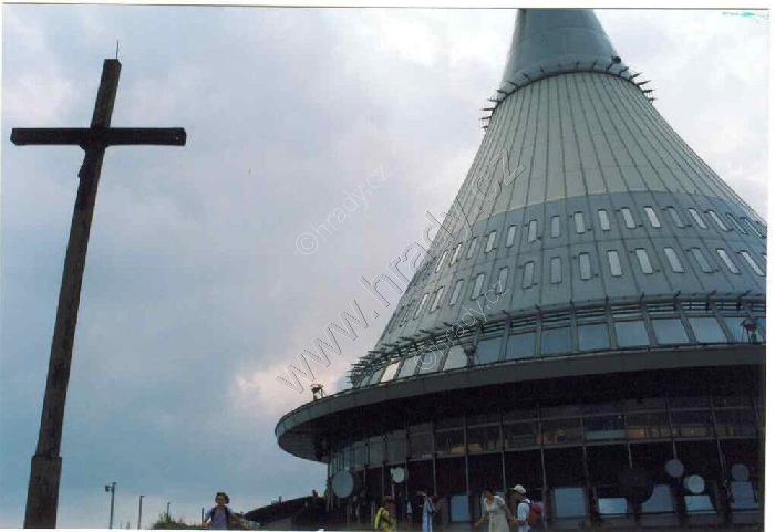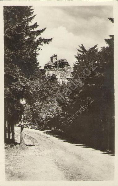 Pohled na dnes již neexistující objekty turistické chaty s honosnou kamennou rozhlednou. Nedatováno, přibližně z konce 50tých let 20.století.