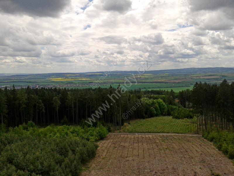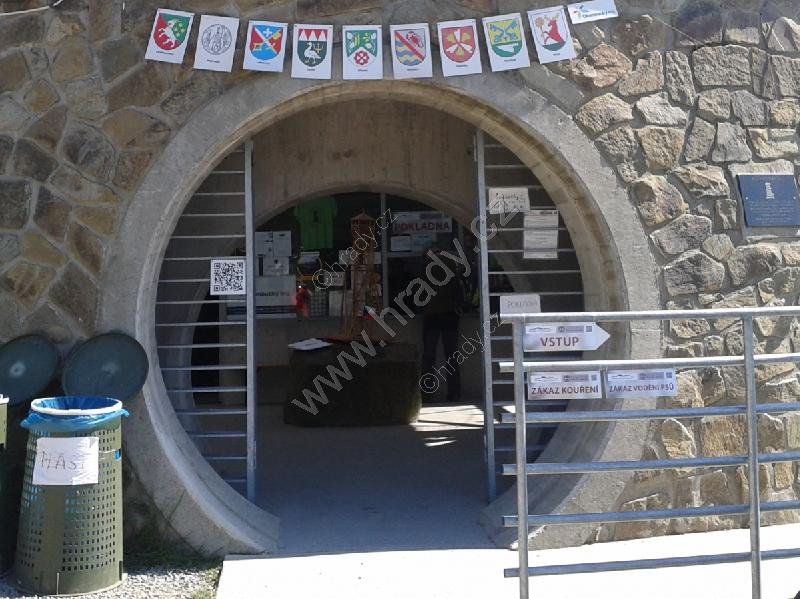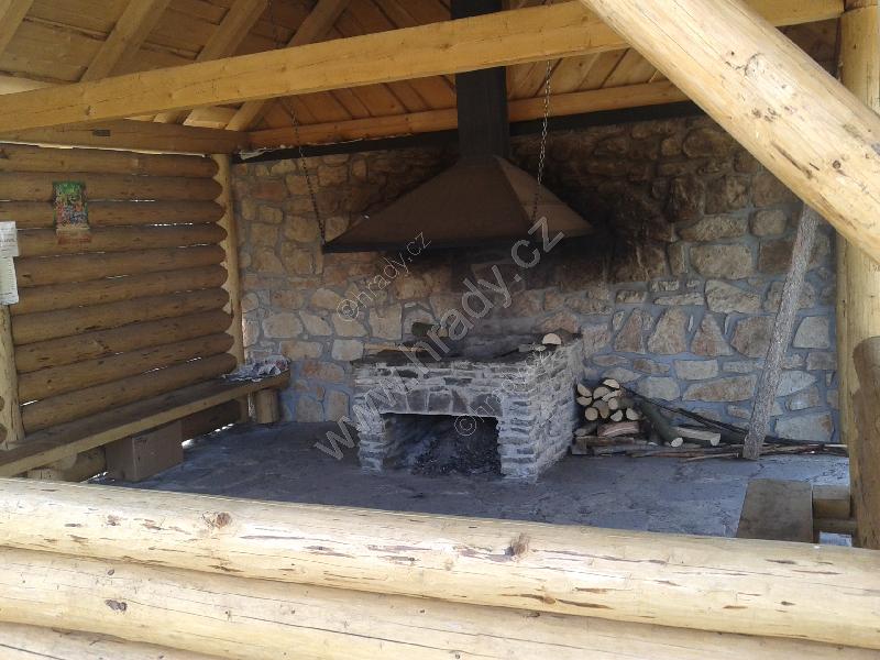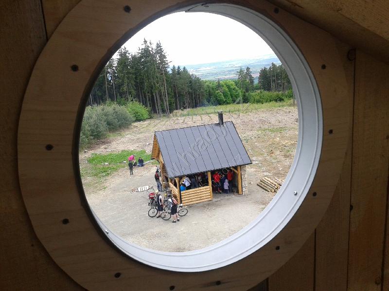 Pohled ze zastřešeného sezení na vrchol. Místo, kde se nalézá vrcholová kniha.